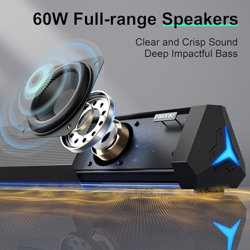 60W Clear and Crisp Sound: The TV sound bar with powerful full-range drivers pump out clean high, strong mid and deep booming bass. Wide frequency range(40Hz-20KHz) and bass/treble adjustment ensure the loud but rich ear-pleasing enveloping surround sound.