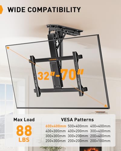 Wide Compatibility: Perlegear’s motorized ceiling TV mount is compatible with most flat or curved 32?-70? TVs up to 88 lbs with VESA mounting patterns 200x100 to 600x400mm. Please verify the size, weight, and VESA pattern of your TV before purchase. NOTE: This ceiling TV mount can be installed on wood joists or concrete but is NOT compatible with sloped ceilings.