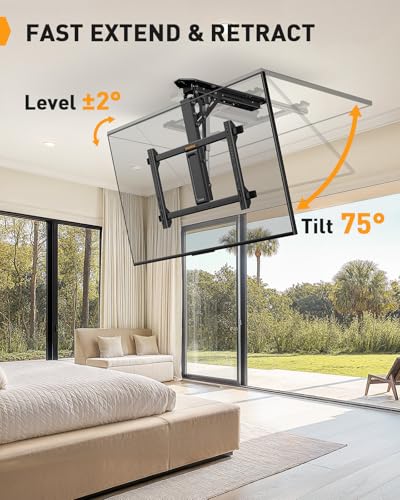 Convenient Remote Control: The ceiling mount TV bracket includes a remote control that operates with 2 AAA batteries (not included). Easily adjust extension from 0°-75° to avoid screen glare or retract your screen when not in use. ±2° leveling allows you to fine-tune your TV on the motorized ceiling TV mount after installation.