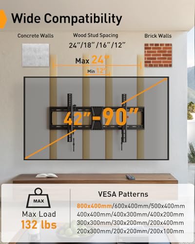 Wide Compatibility: The Perlegear tilting TV wall mount fits most 42?–90? flat or curved TVs with VESA patterns ranging from 200 x 100mm to 800 x 400mm. The TV bracket is compatible with 12?/16?/18?/24? wall studs, concrete walls, and brick walls. Please verify the size, weight, and VESA pattern of your TV before purchase.