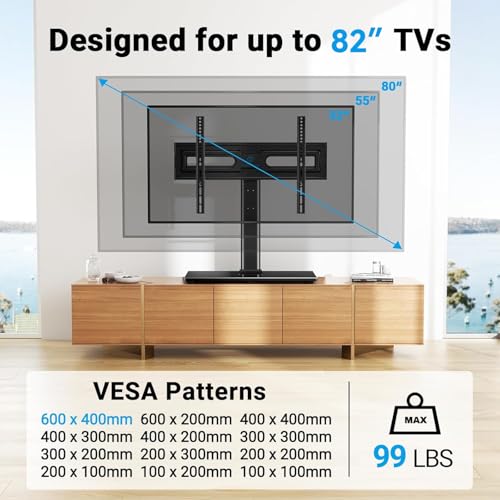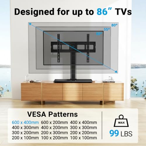 ?LARGER TEMPERED GLASS BASE?This desktop TV stand is with safety locks, robber non slip feet, sturdy tempered glass base to enhanced security. Don't worry about your kids and pets playing nearby. Fits 32-82inch LCD/LED/OLED/Flat Screen/4K TVs up to 99 lbs. Compatible with multiple VESA pattern 100x100mm (4"x4")-600x400mm (24"x16")
