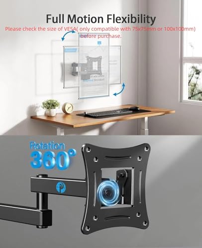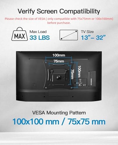 Mount it Anywhere for Everyday Use - Our full motion TV wall mounts match with most 13-32” TVs. Whether you mount flat-screen display TVs or monitors, please check your TV stud location and VESA mount(Max: 100x100mm, Min: 75x75mm) before purchase. Our wall mount tv bracket is beyond your imagination to ensure relax and leisure time.