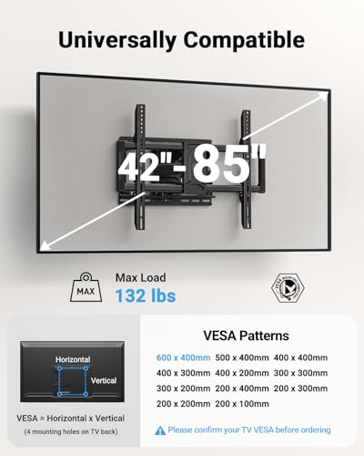 Wide Compatibility: This Pipishell TV mount is compatible with most 42?–85? TVs up to 132 lbs with VESA mounting patterns 200x100 to 600x400mm. The TV wall mount can be installed on 8?/12?/16? wood studs, solid concrete, or brick walls. Please do not mount on drywall alone.