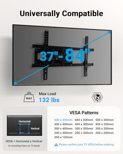 STRONG TV WALL MOUNT BRACKET: Our TV mount is constructed of high-quality steel materials, fits most 37 to 84 inch TVs weighing up to 132lbs, compatible with VESA mounting holes 200x100mm to 600x400mm. Please check the screen size, weight and VESA pattern of your TV before purchase.
