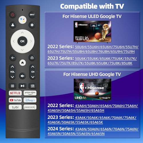 ?Voice Control Compatibility?To use Google TV Voice control, you need to pair through Bluetooth first. Compatible with follwoing Hisense ULED Google TVs: 2022 Series: 50U6H/55U6H/65U6H/75U6H/55U7H/65U7H/75U7H/55U8H/65U8H/76U8H/65U9H/75U9H; 2023 Series: 50U6K/55U6K/65U6K/75U6K/55U7K/65U7K/75U7K/85U7K/55U8K/65U8K/75U8K/85U8K Compatible with following Hisense UHD Google TVs: 2022 Series: 43A6H/50A6H/65A6H/70A6H/75A6H/43A65H/50A65H/55A65H/65A65H 2023 Series: 43A6K/50A6K/65A6K/70A6K/75A6K/43A65K/50A65K/55A65K/65A65K 2024 Series: 43A6N/50A6N/65A6N/70A6N/75A6N/43A65N/50A65N/55A65N/65A65N