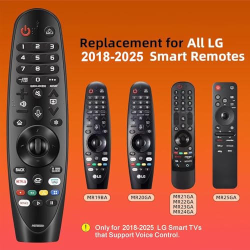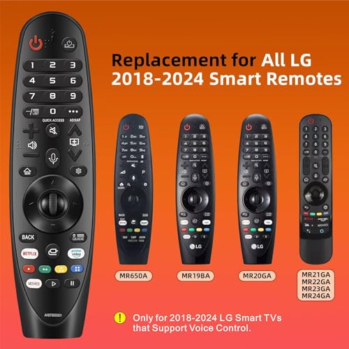 ?Broad Compatibility?This premium remote is compatible with all LG Smart TVs from 2018 to 2024 that support voice control. It’s an ideal replacement for LG Magic Remotes, including (but not limited to) MR20GA, MR19BA, MR24GN/GA, MR23GN/GA, MR22GA/GN, MR21GA/GC, MR18BA, AKB76039902, AKB75855501 and more.?Important Notice?This remote may not pair with TVs that do not support voice control or were released before 2018. It is Not compatible with soundbars.
