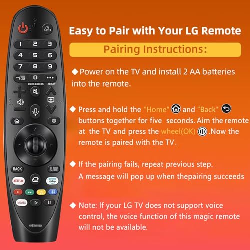 ?User Instructions?to unlock the full functionalities of this magic remote, please 1) Install two AA batteries and turn on the TV. 2) Hold the "Home" button and "Back" button for 5 seconds, then aim the remote at the TV and press the Wheel (OK) button. A message will pop up and this remote is now paired with your LG TV. If the pairing fails, please repeat this step until the pairing is successful.