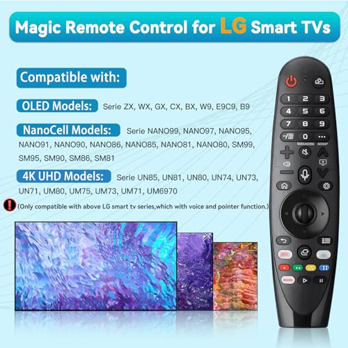Applicable TV Series: Replacement magic voice remote control fit for LG UHD OLED QNED NanoCell 4K 8K Models: ZX, WX, GX, CX, BX, W9, E9, C9, B9, Nano 75, Nano 80, Nano 85, Nano 90, Nano 99 etc. SM99, SM95, SM90, SM86, SM81, UN85, UN81, UN80 UN74, UN73, UN71, UM80, UM75, UM73, UM71, UM6970 series