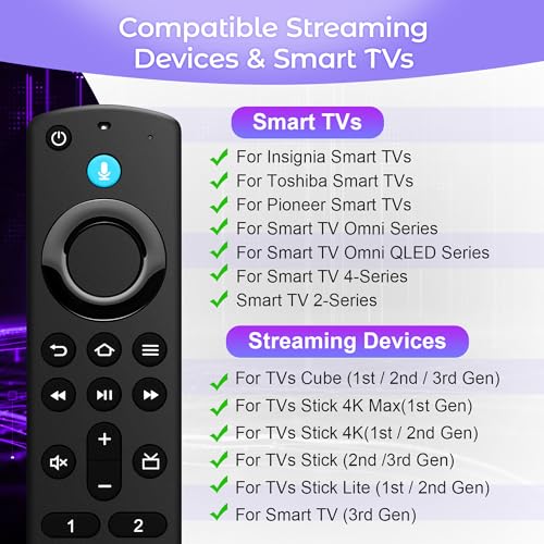 Compatible With: This stick remote control compatible with Smart TV (3rd gen), TV stick (2nd gen/3rd gen), TV Stick 4K (1st / 2nd Gen), TV stick lite, TV stick 4K max (1st / 2nd Gen), Smart TVs cube (1st gen/2nd gen/3rd gen), Compatible With Insignia-Pioneer Smart TV,Pioneer, Omni Smart TVs