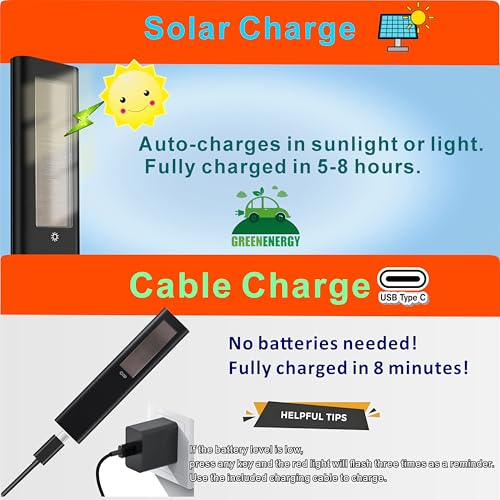 ?Battery Tips?: 1. Low battery? Press any key for a 3-flash red light reminder. 2. Charge with 5V/2A charger (8-minute full charge; other chargers may take longer). 3. Lasts over 3 months maximum per full charge. 4. Recharge 5 minutes every month, the solar cell can last over 10 years. Under normal usage, the battery capacity won't degrade for more than 3 years.