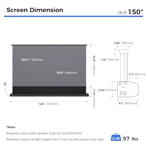 ?Perfect Visual Effect?—With a screen size of 150 inches and a 16:9 aspect ratio, this screen offers a standard view area of 140"Wx74.9"H. The screen material has a 1.1 gain, providing a vivid viewing experience from 140 degrees. It also offers 75% ALR resistance and is compatible with 8K/4K resolution Ultra HD & Active 3D content.