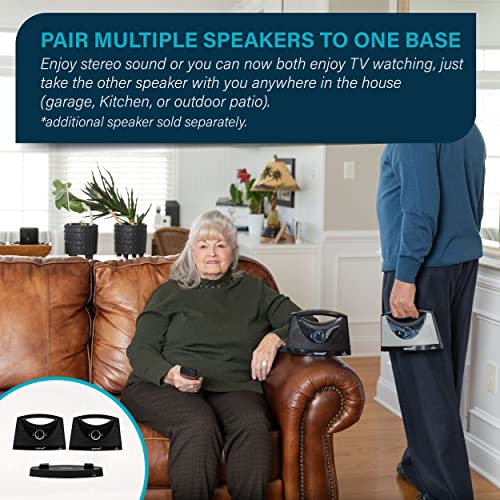 Pair Multiple Cordless TV Speakers To One Base – Enjoy stereo sound or you can now both enjoy TV Watching, just take the other speaker with you anywhere in the house - Garage, kitchen, or outdoor patio. PLEASE NOTE: This speaker does not come with a transmitting base, it requires SEREONIC Model BT-200, BT-200B, or BT-200GS.