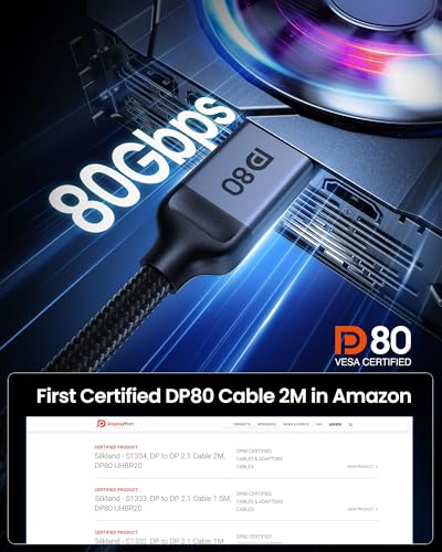 ?VESA Certified DP80 Cable 2M?Silkland 6.6FT Display Port 2.1 Cable is the first VESA-certified DP80 cable on Amazon. With 80Gbps bandwidth, it supports uncompressed 4K@240Hz, 8K@60Hz and 2K@540Hz resolution. Up to 16K@60Hz, 8K@240Hz, 4K@960Hz 540Hz 480Hz 360Hz with DSC enabled. DP80 cable compatible with UHBR20, dynamic HDR10+, 3D, and HDCP 2.3 for superior visuals. Backward compatible with DP 2.0, and DP 1.4, and supports flawless 7.1/5.1/2.0 uncompressed audio pass-thru