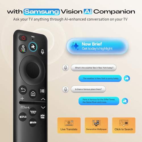 ?Smart AI Companion?Turn your TV into an intelligent AI hub. Ask questions, explore personalized entertainment, personalized movie recommendation, or design travel itineraries through natural, AI-powered conversations, and so much more. Experience stunning visuals and immersive sound enhanced by AI, plus smart features like Live Translate and Generative Wallpaper.