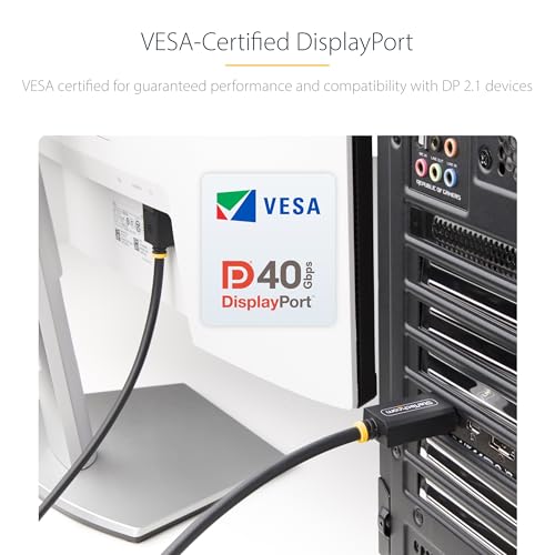SPECS: Black; 6-foot; VESA-Certified DisplayPort 2.1; DP40 (40Gbps); Supports UHBR10/HDR/MST/DSC 1.2/HDCP 2.2; 8K 60Hz w/DSC, 4K 144Hz, 1440p 240Hz; 32-ch Audio; Backward Compatible w/DP 2.0/1.4/1.2; 30AWG; 6.5mm (0.26in) O.D.