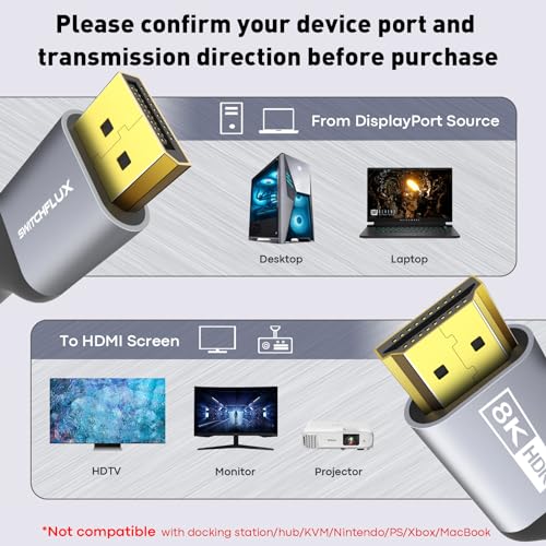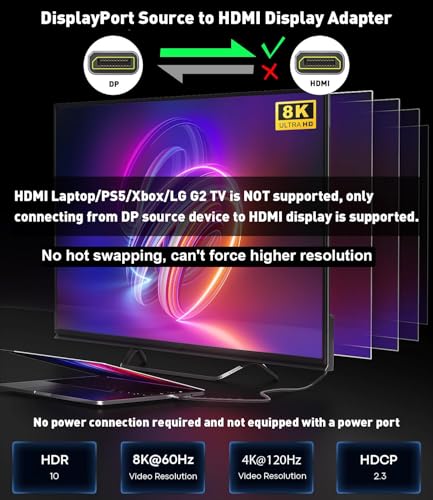 ?DisplayPort 1.4 to HDMI 2.1 Cable?8K DisplayPort to HDMI cable support high resolution 8K(7680x4320)@60Hz,4K(3840x2160)@120Hz/60Hz,2K( 2560x1440)@144Hz/120Hz,1080p@165Hz/144Hz/120Hz. support Dynamic HDR and DSC 1.2, HDCP 2.3 compliant. backward compatible with DisplayPort 1.3, 1.2, 1.2a, 1.1 and 1.0. support 7.1, 5.1, 2.0 uncompressed Perfect audio passthrough for digital audio channels---( Not compatible with LG C2/CX TV, Not support 240Hz refresh rate) - HDMI laptops are not supported, only connections from DP source devices to HDMI displays are supported,no hot swapping,can't force higher resolution