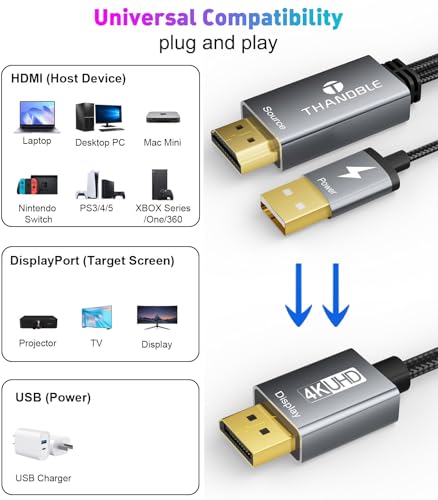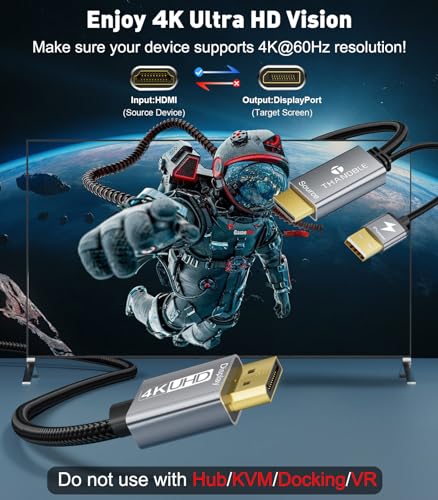Crystal Clear 4K High Resolution: THANDBLE HDMI to DP cable adapter is a necessity for your home entertainment or out of office, amazing 4K@60Hz UHD resolution can bring you extraordinary visual clarity, and backward compatible with 4K@30Hz, 2K@60Hz,1080P@120Hz/1080P@60Hz, 1080i, 720P resolution.(Note :It is not a bi-directional converter, it can only transfer signals from HDMI to DisplayPort in one direction. not supported 1440P@144Hz and function DDC/CI)