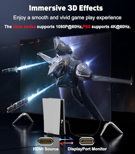 Wide Compatibility: HDMI to Display Port cable supports everything from connecting a video source from the HDMI port to the DP port for display, compatible with PCs, desktops, graphics cards, laptops, AMD, NVIDIA, Raspberry Pi, MacBook Pro, ps5/4/3, Xbox One/360 and other devices with HDMI output port ( Note: Switch and Xbox series only support 1080P@60Hz resolution display)