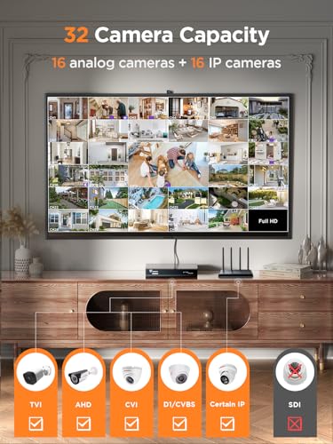 Secure your home and business with this TIGERSECU Ultra HD 5MP 16 channel security DVR, a full featured hybrid digital video recorder with 32-camera capacity. Connect 16 analog CCTV cameras to 16 BNC ports, and a further 16 network IP cameras for a complete 32-camera surveillance system. Compatible with HD-TVI, AHD, CVI, and CVBS (D1) cameras, specific models of IP cameras, and RS 485 PTZ cameras.