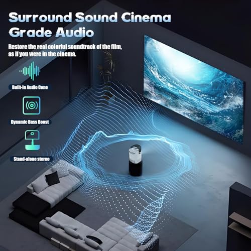 ?Powerful HIFI Audio & Advanced Bluetooth 5.2?This projector with stand is equipped with a high - power HIFI speaker, which utilizes a full - range high - fidelity sound field to simulate a three - dimensional surround sound effect. With a large 500CC sound chamber, it delivers a palatial - level bass that rivals professional audio equipment. Listen to soul-stirring music as if you were at a concert! Additionally, it features the latest two - way Bluetooth 5.2 technology, allows you to effortlessly connect your devices to stream audio directly or use the movie projector as a Bluetooth speaker for your favorite music