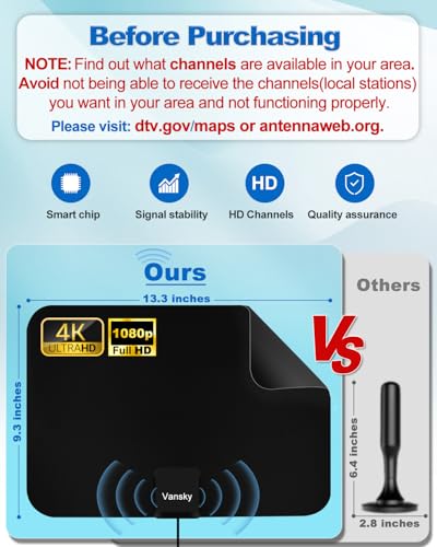 Weather Resistant - Vansky indoor TV antenna is for indoor using. HD Antenna indoor is lightning protected, durable design with grounding done -don’t get struck out by bad weather.