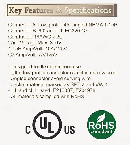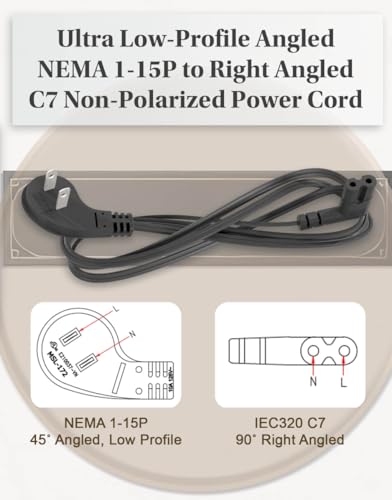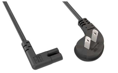 Space-Saving Right-Angle Design – Features a molded ultra-low-profile NEMA 1-15P plug with a 90? angled C7 connector, perfect for tight spaces and indoor use.