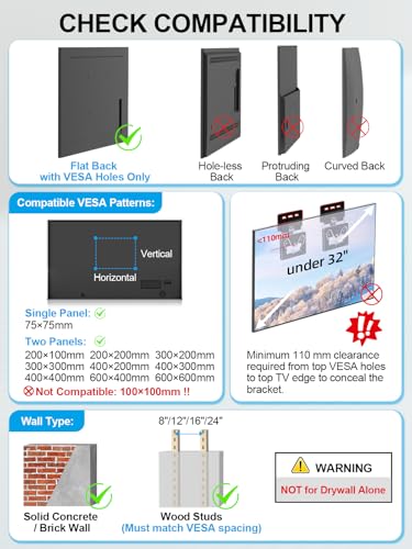 Wide Compatibility: Perfectly tailored for 14"" to 80"" 4K LED/LCE/OLED flat/frame TV, this mount supports single-wall panel installations with 75×75mm VESA and dual-wall panel setups from 200×100mm up to unlimited sizes. Widely compatible with TCL, Samsung, Sony, Panasonic, Toshiba, Sharp, LG, Philips, JVC, and more brands frame TV. (Not for 100x100mm VESA.)