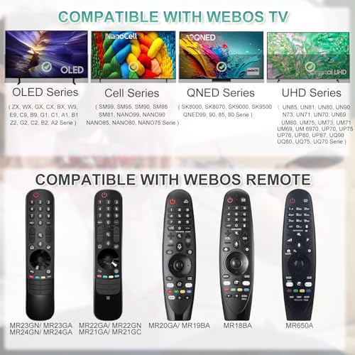 TV Compatibility: This Magic Remote Control Replacement Is Compatible with LG Smart TVs (2019-2025 Models). It Is Confirmed to Work with NanoCell Series (Including NANO75, NANO80, NANO99, SM86, SM90), QNED Series (Including QNED75, QNED80, QNED85), OLED Series (Including A1, B2, C3, G1, G2, LX1, Z2), and 4K UHD Series (Including UN71, UN80, UM69, UM73, UQ8000, UR9000). Perfect for webOS TVs.