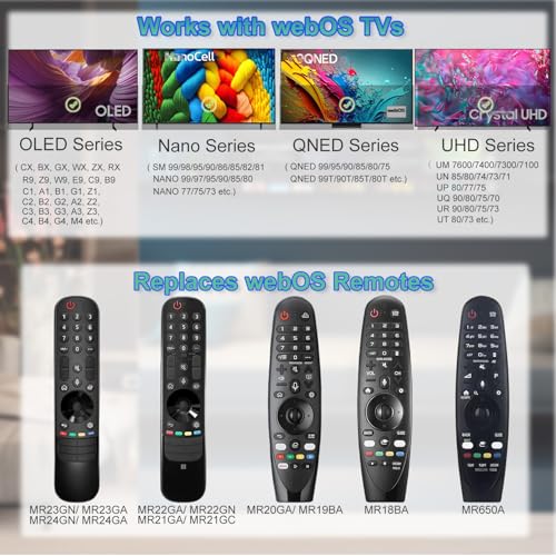 Works with webOS TVs: This Magic Remote Control Replacement Is Compatible with LG Smart TVs (2018-2025 Models). It Is Universally Compatible with All OLED Series (Including Z/G/C/B/R/M), NanoCell Series (Such as NANO99/97/95/90/85/80/77/75), QNED Series (Including 99T/90T/85T/80T), and 4K UHD Series (Covering UM/UN/UP/UQ/UR/UT Models).