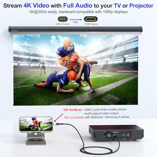 Video Transmission Cable: USB-C (phone) to HDMI (TV) cable is only compatible with devices that support USB-C ports (DP Alt Mode), and not all USB-C ports support Alt Mode functionality. The supported resolution and refresh rate depend on the specifications of the host device, the cable, and the connected display.