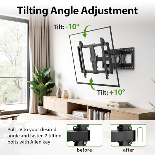 Upgrade Viewing Experience: This Slim full motion TV Bracket 75inch with double articulating arms includes +10°/-10° tilt, ±45° swivel (maximum swivel angle depends on your TV), multi functional adjustment allows the TV to move flexibly, reduce reflections, and upgrade your viewing experience