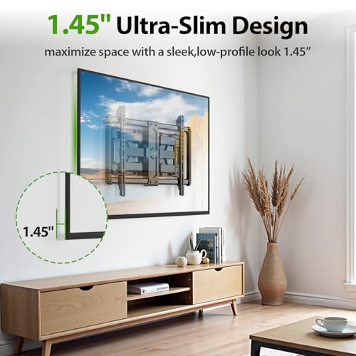 Space Saving: Super Slim Television Mount 65inch places TV just 1.45'' from the wall when fully retracted, which narrows the gap between TV and the wall and greatly saves space. In addition, Articulating Mount can extend up to 11.92'' for easy cable access and closer viewing angle