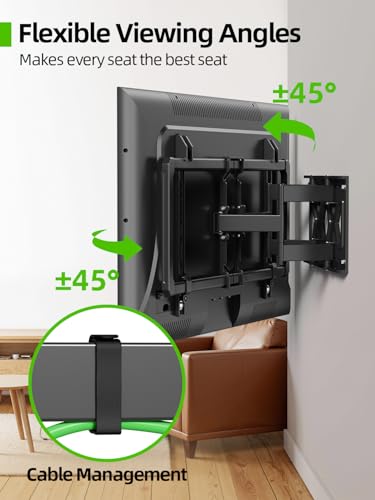 Adjustable View Comfortable & Glare reduction : Our TV bracket with dual articulating arms includes +10°/-10° tilt, ±45° swivel (maximum swivel angle depends on your TV). All of these features will make your TV flexible, say goodbye to annoying glare, and allow for better viewing depending on your seating in the room.