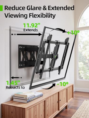 Space Saving :Ultra slim TV wall mount offers a great space saving solution with a stylish appearance by placing the TV bracket 1.45 inches closer to the wall. Meanwhile, this large full motion TV mount can extend 11.92 inches for comfortable viewing.
