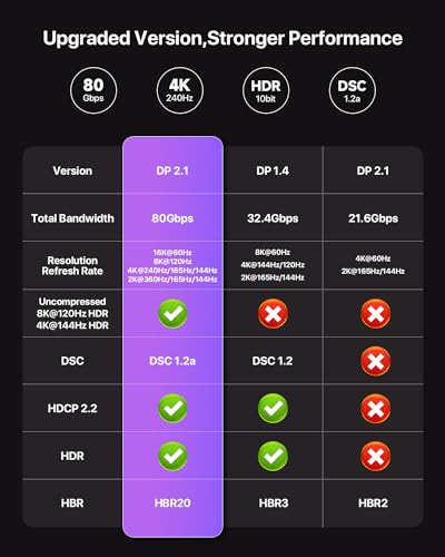 ?Advanced DisplayPort Cable 2.1?Certified by the VESA Association,VisionSync DisplayPort 2.1 Cable supports higher resolutions 16K(15360*8640)@60Hz with DSC,8K@120Hz,4K@240Hz/165Hz/120Hz/144Hz, 2K@360Hz. Supports Dynamic HDR,HBR20,HDCP 2.2,DSC1.2a.Furthermore,it backwards compatible with DisplayPort 2.0/1.4/1.3/1.2/1.2a/1.1 and 1.0.Support 3D stereo imaging technology which ensure your immersive viewing experience.(Note: It's for DP to DP connections, Not for HDMI or Mini DP)