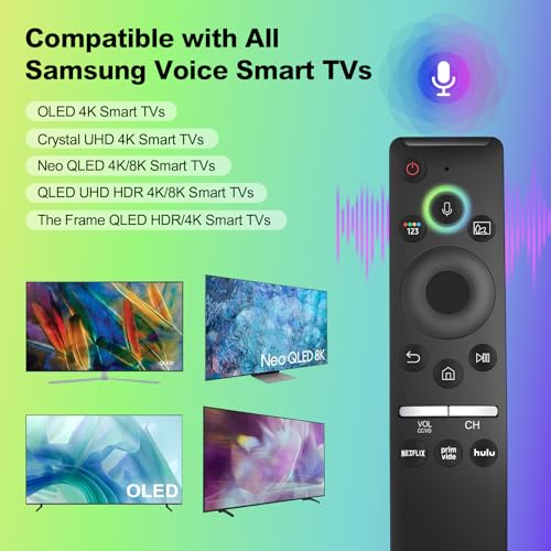 Completely Compatible: The upgrade universal remote control compatible with Samsung Voice Function Smart Frame Curved Crystal UHD Neo QLED OLED 4K 8K TVs. And it can replace most of Samsung remote controls, is an excellent backup remote for Samsung smart TVs. If your TV does not support the voice function, it may cause the voice buttons not to work.