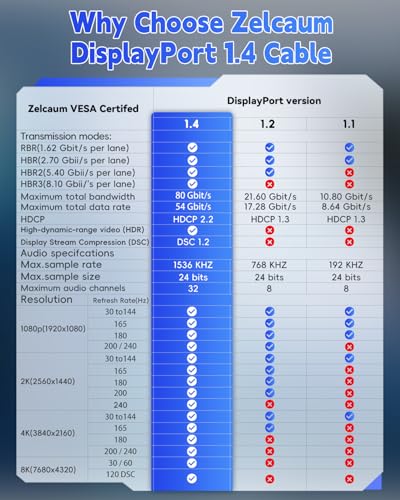 ?HDR10 and 3D Support?Zelcaum 1.5FT 8K displayport 1.4 cable supports HDR10, HDCP 2.2, HDCP 1.4 and 3D technology, providing richer colors and deeper visuals, making every frame more realistic and immersive