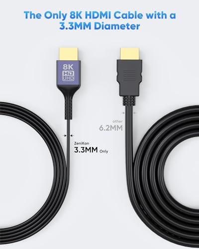 Ultra Thin Flexible Design: The latest 8K HDMI cable diameter is only 3.3 mm that is less than 70% of regular cables. Designed to be lighter and flexible&slim, easy to use and carry (weight:1.76oz). Ideal for travel, office and home use to save space