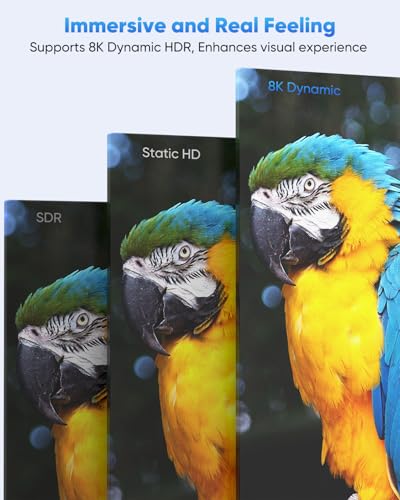 8K@60Hz UHD Video: Ultra thin HDMI cable complies with standard HDMI version 2.1. Support resolution to 8K@60Hz, Backward compatible with 4K@120Hz, 4K@60Hz, 2K@144Hz,1080P. also support 3D, 48-Bit Deep Color, Dynamic HDR, eARC, HDCP2.2&2.3, DTS:X, Dolby Atmos,Dolby Vision, Dolby TrueHD 7.1 audio. Provides you realistic and immersive video&audio experiences
