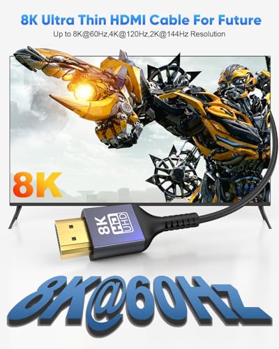 Universal Compatibility: The 8K HDMI cable thin can easily transfer perfect audio and video signals?compatible with all HDMI devices: HDTV, Laptop, Monitor, PS5/PS4, Fire TV, Roku TV, Switch, Blu-ray player, Computer, XBox Series, Graphics Cards etc